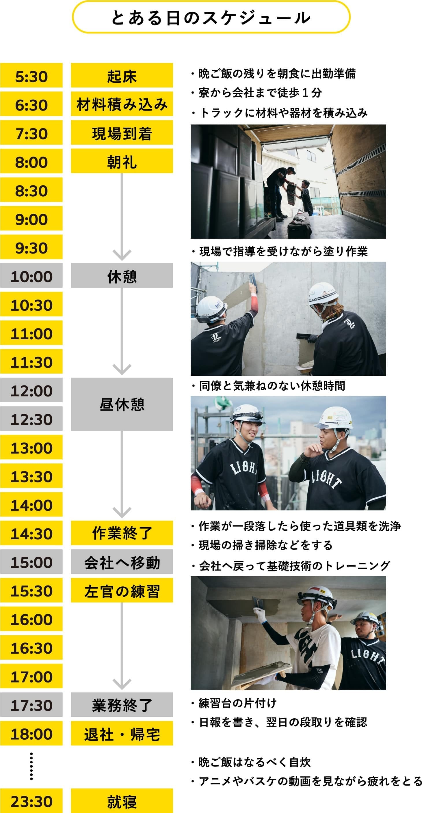 会社には練習台もあって現場であまり塗れない時にも腕を磨くことができます。また徒歩1分の場所に社員寮もあって、自分も入居しているんですが、仕事が朝早いので本当に助かります。